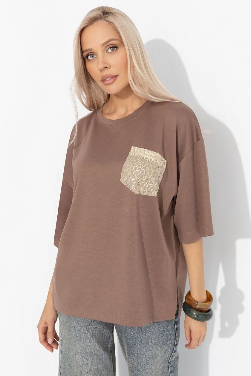 Футболка коричневая с карманом из пайеток