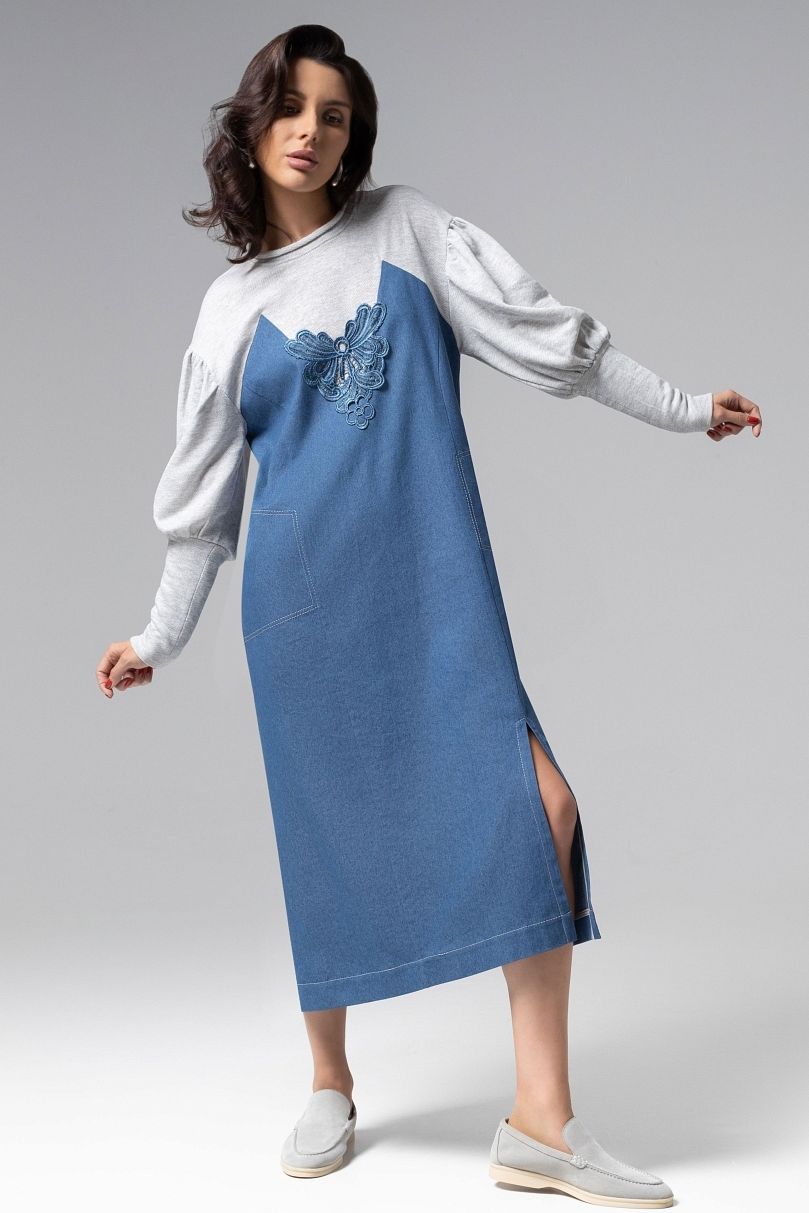 Платье синее из джинсы с вышивкой от компании Charutti. Модель свободного силуэта, верх - мягкий хлопковый трикотаж. Длинные рукава. В боковых швах - карманы. Идеальный выбор для Вашего стильного гардероба.