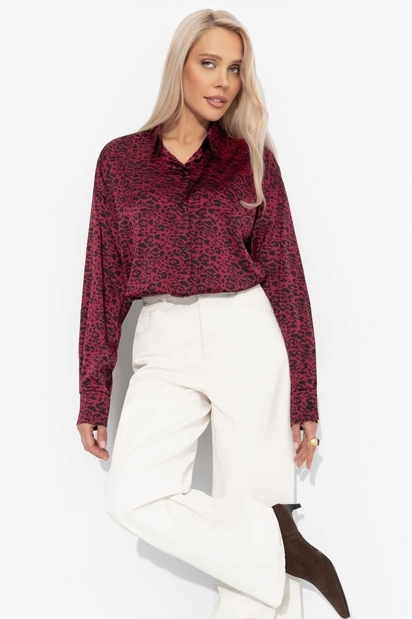 Рубашка бордовая с леопардовым принтом от компании Charutti, выполнена из шёлка "Армани". Модель свободного силуэта. Горловина оформлена отложным воротником на стойке. Втачные длинные рукава с манжетами. Центральная застёжка на петли и пуговицы. Отличный выбор как для отдыха, так и для деловой встречи.