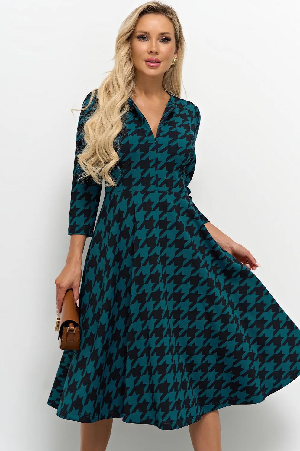 Стильное платье миди от производителя Jetty. Модель полуприлегающего силуэта, выполнена из трикотажа в цвете морской волны. Круглый вырез горловины по переду переходит в застёжку на молнию. Втачные рукава, длиной 3/4. Отрезное по линии талии. Расклешённая юбка слегка присборена. Отличное решение для Вашего гардероба.