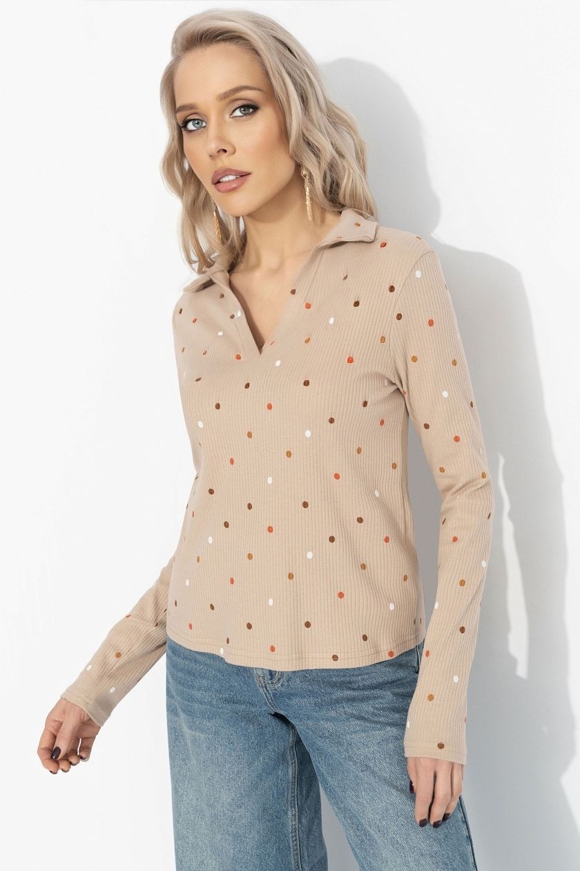 Поло с длинным рукавом в цвете латте от компании Charutti. Модель прямого кроя, выполнена из трикотажного полотна "Интерлок Карде" с принтом "горошек". Отложной воротник переходи в V-образный разрез. Идеальный выбор для Вашего повседневного гардероба.