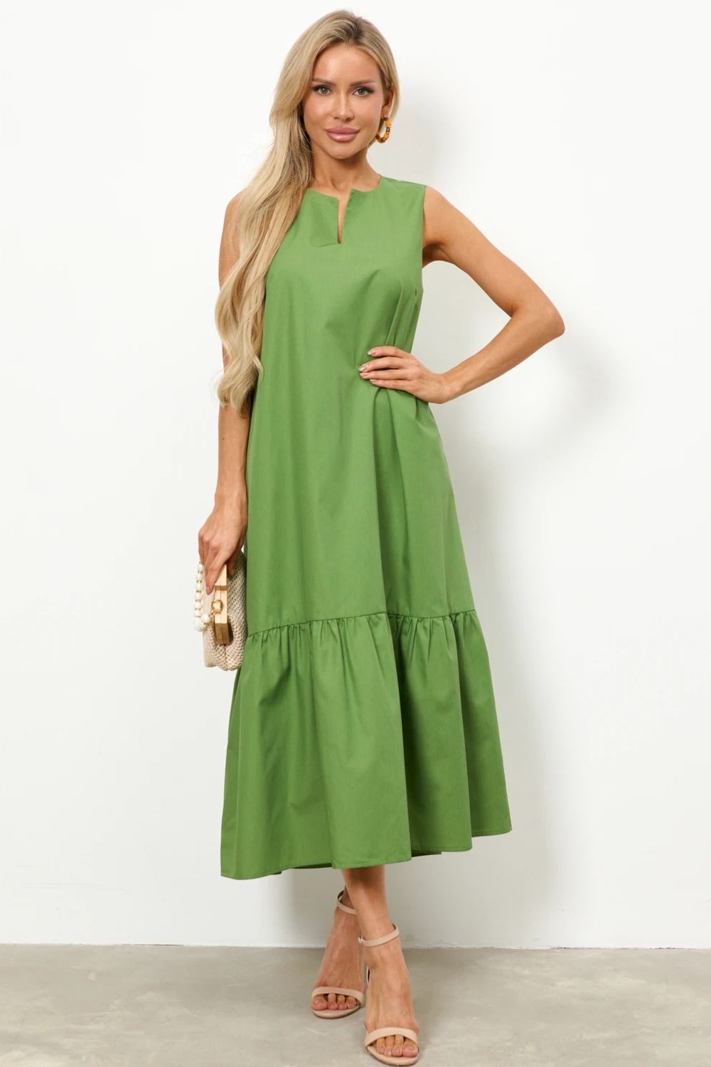 Платье без рукавов цвета хаки от производителя Jetty. Модель свободного силуэта, выполнена из хлопка. Фигурный вырез горловины. По низу платья пришит ярусный волан. Идеальный выбор на каждый день.