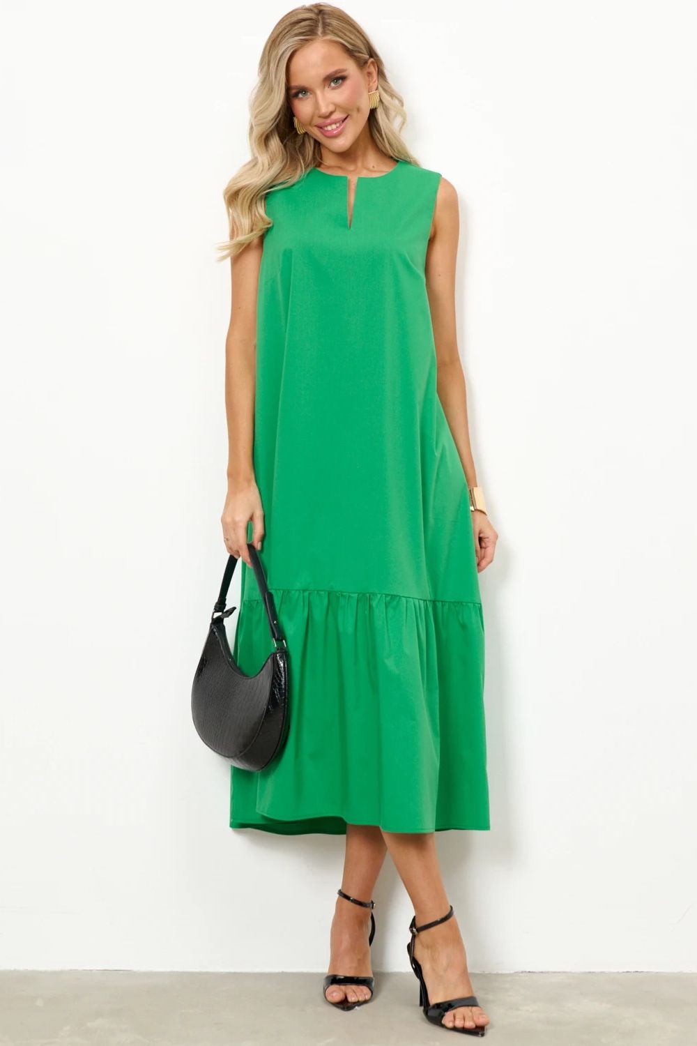 Платье без рукавов зелёного цвета от производителя Jetty. Модель свободного силуэта, выполнена из хлопка. Фигурный вырез горловины. По низу платья пришит ярусный волан. Идеальный выбор на каждый день.
