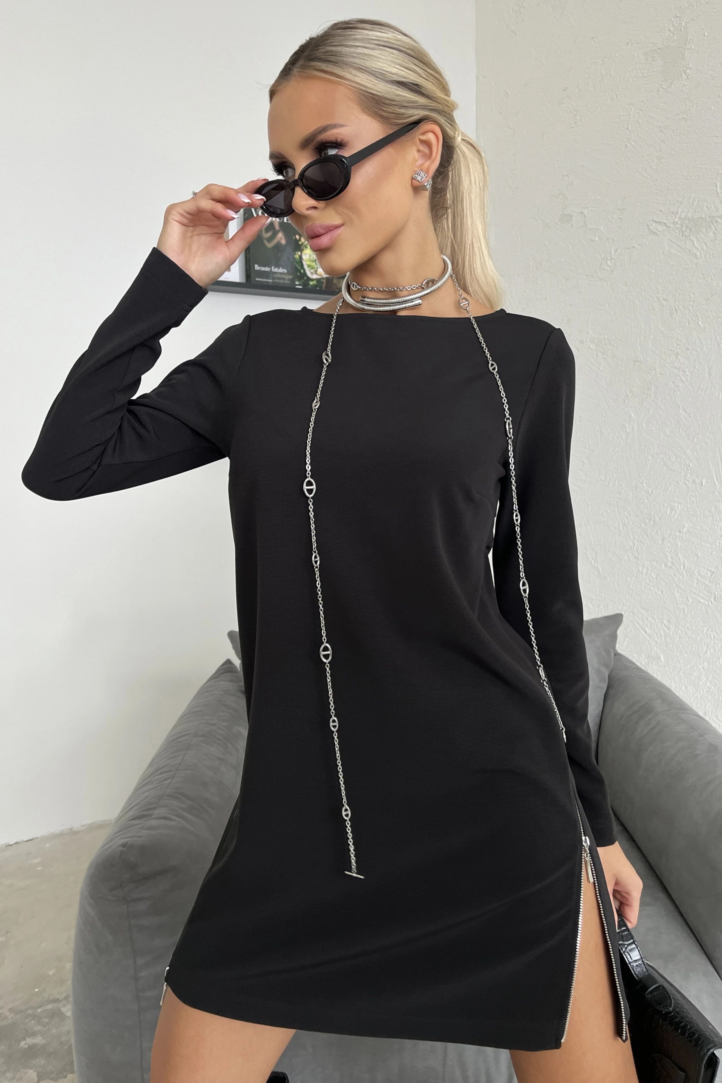 Платье чёрное с молниями в боковых швах от бренда Jetty. Модель А-силуэта, выполнена из крепа. Вырез горловины - лодочка. Длинный втачной рукав. Спинка со средним швом. Удачный выбор для повседневного гардероба.