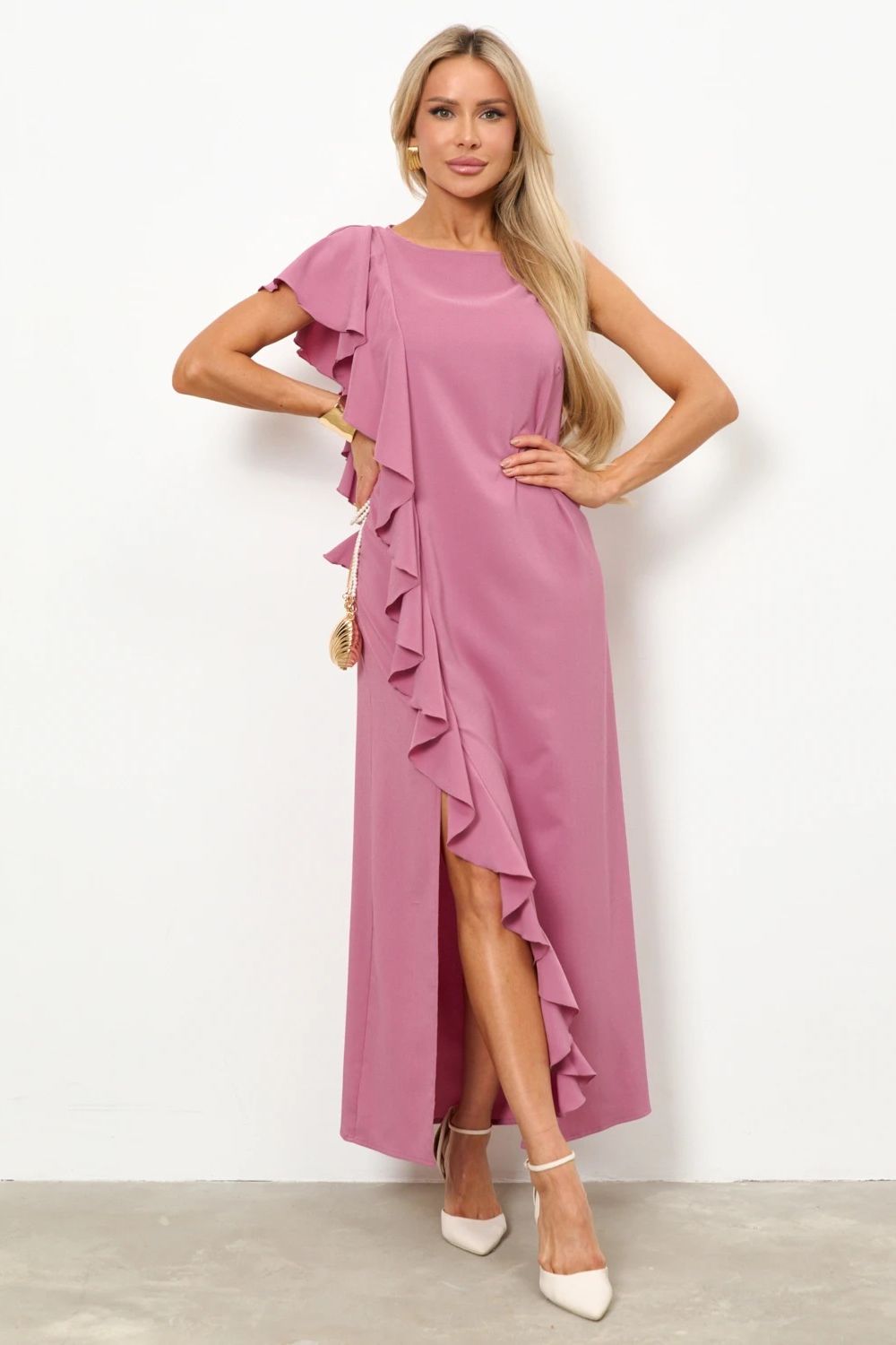 Платье длинное розовое с воланом от производителя Jetty. Модель прямого силуэта, выполнена из плательного полотна. Перед и спинка с одной стороны изделия декорированы пришивным воланом, который мягко ложится на плечо и имитирует рукав. НИз дополнен разрезом. Прекрасно дополнит Ваш гардероб для любого мероприятия.