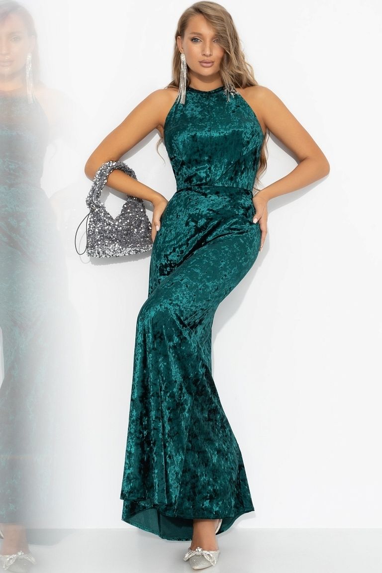 Платье зелёное бархатное с акцентной спинкой от компании Charutti. Модель полуприлегающего силуэта. Комфортная посадка, платье красиво драпируется, подчеркивает фигуру. Идеальный выбор для создания женственного образа.