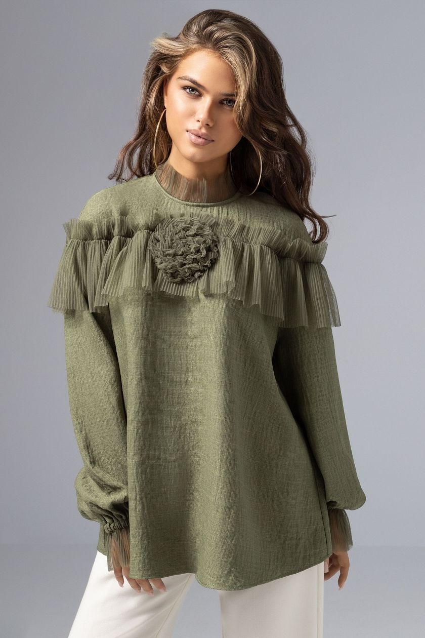 Блузка зелёная оригинального дизайна от компании Charutti. Модель свободного силуэта, горловина оформлена круглым вырез. Втачные длинные рукава оканчиваются резинкой. Деликатные рюши в зоне плеч и горловины и рукавов. Идеальный выбор для торжественного мероприятия.