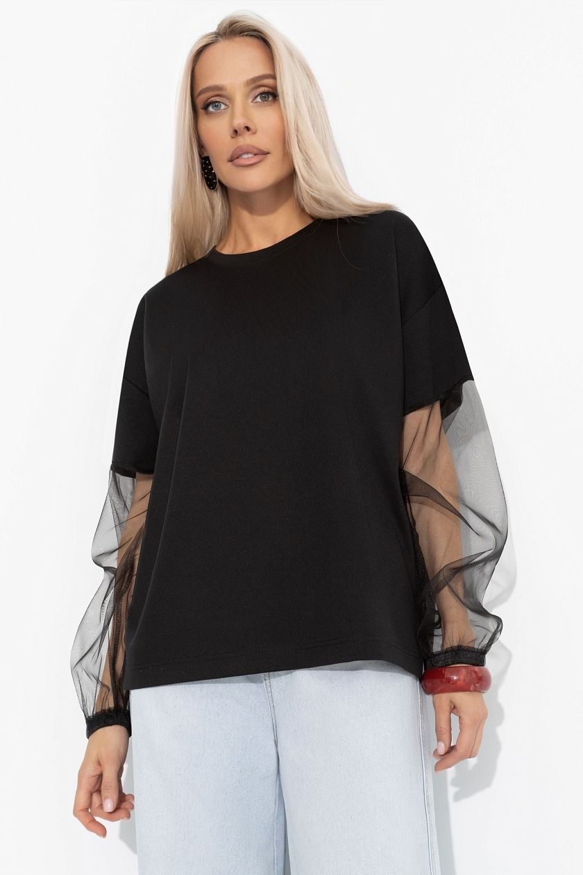 Футболка чёрная с акцентными рукавами от компании Charutti. Модель прямого силуэта, выполнена из трикотажной ткани "милано". Часть рукавов оформлена тонкой сеткой. Манжеты рукавов прошиты из основного материала. Линия плеча спущена. Деликатные разрезы по бокам изделия. Идеальный выбор на каждый день.