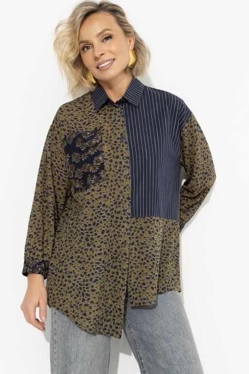 Рубашка ассиметричного кроя от компании Charutti. Модель свободного кроя, выполнена из комбинированных тканей: трикотаж «дорис» + рубашечная «поплин», «штапель».Еесть карман на передней части изделия. Чуть укороченный рукав оформлен широкой скрытой резинкой. Изделие застегивается на пуговицы.Идеальный выбор для городских модниц.