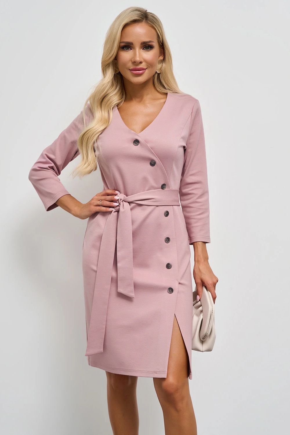 Платье трикотажное с поясом в цвете пыльная роза от производителя Jetty. Модель с имитацией запаха по переду. V-образный вырез горловины. По переду изделия пришиты декоративные пуговицы. Спереди разрез. Рукава 3/4. Талия отрезная. Спинка со средним швом. Прекрасно дополнит Ваш гардероб для любого мероприятия.